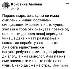 Ама сега единствено се злоупотребува терминот ,,социјален дијалог,,, а има монолог. Ама па ние сме навикнати и ништо веќе не не чуди. Битно да сме на страната на правдата, на вистината, да помогнеме најмногу што можеме на обичниот народ и работник, секако, согласно нашите можности. Револтот и по социјалните мрежи си го забележуваат, па нека им е на чест.