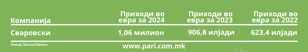 Компанијата Сваровски бележи значителен и континуиран раст на приходите во последните три години. Овој раст е особено впечатлив меѓу 2022 и 2023 година, кога приходите скокнаа за речиси половина. Во 2022 година љубителите на овој кристал оставиле 623,4 илјади евра во касите на Сваровски, а во 2023 година ‒ 906,8 илјади евра. Во 2024 година растот е побавен, но сѐ уште стабилен.