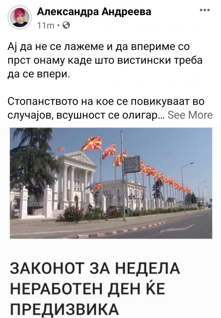 Андреева: Малите компании сакаат неработна недела, на олигарсите не им одговара