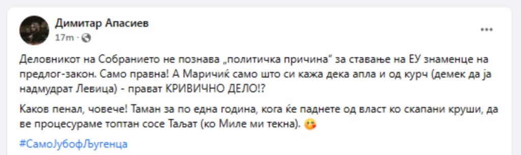 Фејсбук статус на Димитар Апасиев: