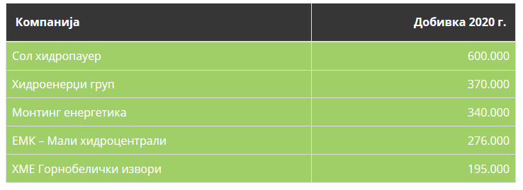 Така на врвот на табелата е компанијата „Сол хидропауер ДООЕЛ “ од Скопје која чиј основач е „Соул спа“ од Италија, а кои имаат пет хидроелектрани. Податоците покажаа дека оваа компанија минатата година имала приход од 2 милиони евра, и дека тој е речиси 34 проценти поголем отколку во 2019 година. Неговата добивка е над 600.000 евра (248 проценти поголема отколку во 2019 година) и тоа е најголемата добивка што некоја компанија ја остварила во бизнисот со мали хидроцентрали.