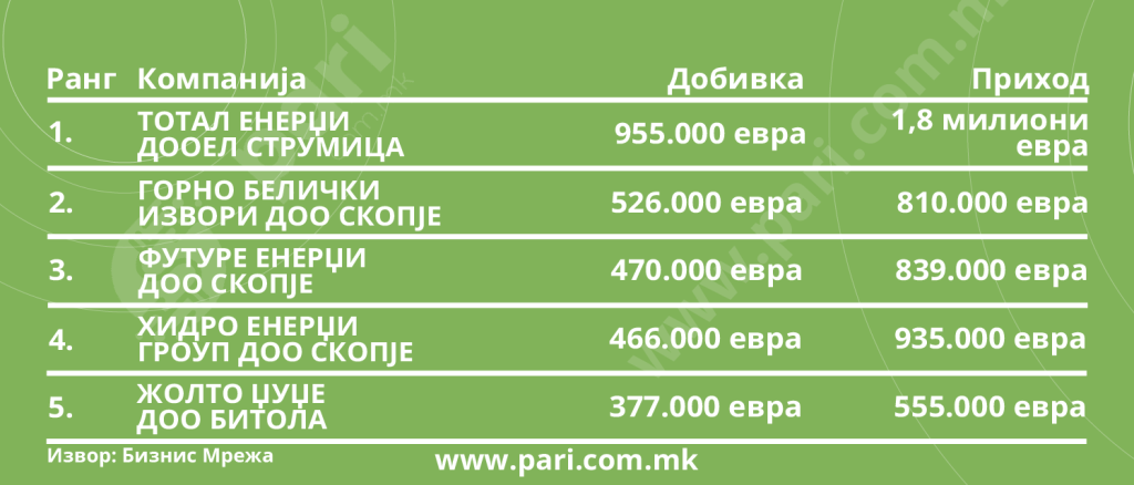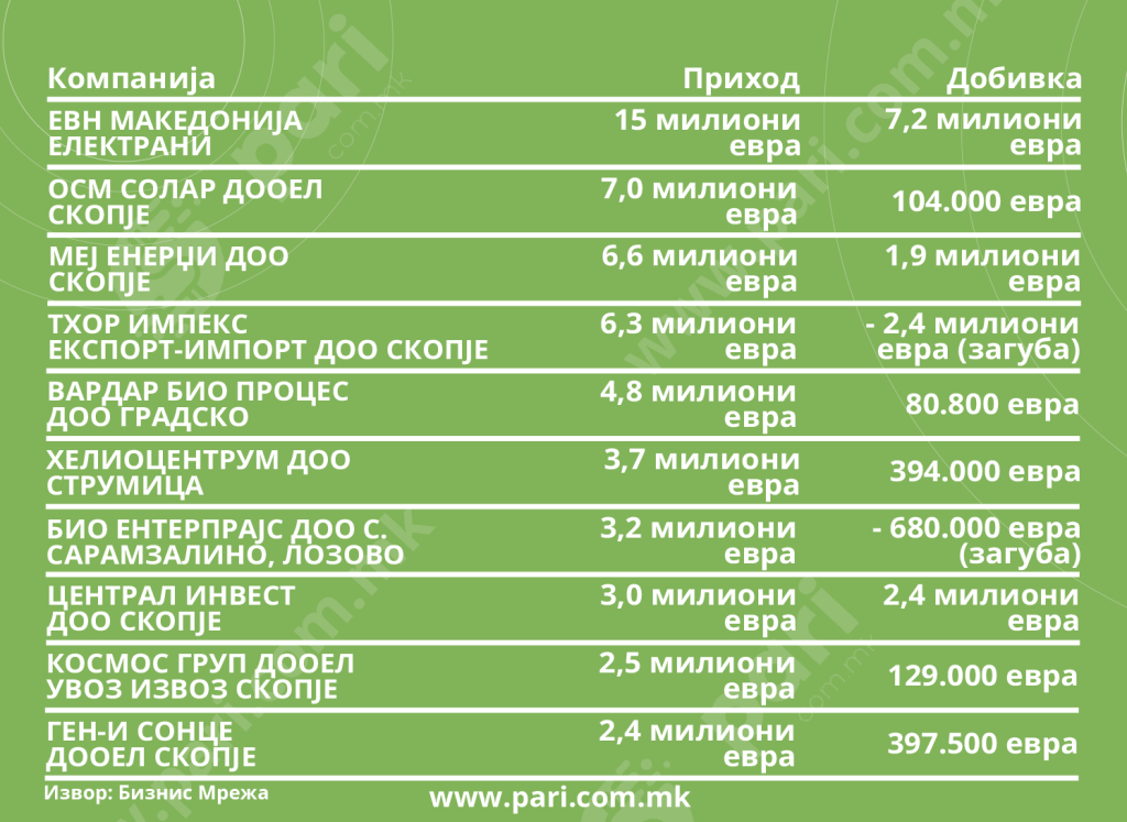 Пари, во соработка со Бизнис мрежа, ги анализираше најголемите производители на струја од обновливи извори. Пресметките покажаа дека десетте најголеми по приход, направиле заеднички промет од 54,8 милиони евра во 2024 година, десетте компании што се на врвот по добивки направиле заеднички профит од 15,1 милион евра, а најголемите 10 работодавачи меѓу ваквите производители на струја, заедно имаат само 154 вработени.