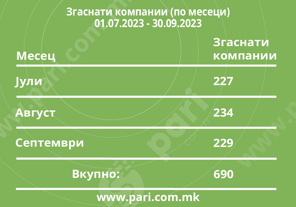 Во третиот квартал од годинава престанале да постојат 690 фирми. Тие не успеале да ја одржат својата деловна активност. Во 2022 година, пак, деловната приказна ја завршиле дури 6.857 фирми, што значи дека сега за три месеци згаснале само 10 проценти во однос на вкупно затворените во текот на минатата година. Сепак, тоа не е резултат од подобреното работење на компаниите, туку на измените во Законот за трговски друштва, според кои, нема бришење по „службена должност“ на фирмите кои не доставиле завршна сметка за последната деловна година, од страна на Централниот регистар. Па така, ја нема големата февруарска чистка, кога обично се бришеа по 3.000 компании.