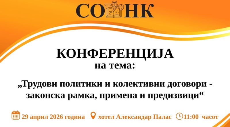 На ден 29.04.2026 година, Самостојниот синдикат за образование, наука и култура на Република Македонија – СОНК одржа конференција на тема „Трудови политики и колективни договори – законска рамка, примена и предизвици“, посветена на 1 Мај – Меѓународниот ден на трудот.