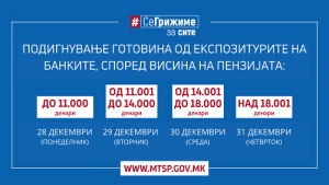 – Во понеделник, на 28.12.2020 година исплата на пензии со висина до 11.000 денари;