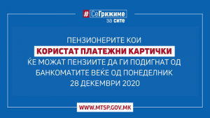 Пензионерите кои користат платежна картичка, поврзана со сметката на која се префрлува пензијата, со парите можат да располагаат од понеделник 28 декември. Тие можат да ја подигнат пензијата на банкомат, да ги користат средствата за плаќање во трговската мрежа или за електронски плаќања.