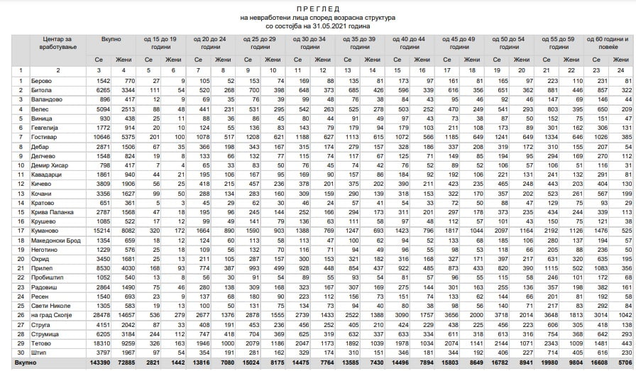 Според податоците на Агенцијата за вработување, согласно 31 мај 2021 година, гледано според возраст најголема невработеност има кај лицата од 55 до 59 година, со што структурата на невработеност оваа година се менува. Таа изнесува 19,980 лица.