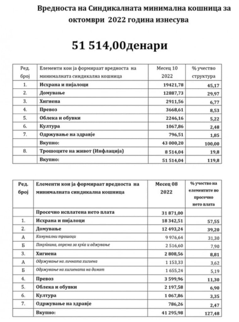 Од таму велат дека ја изработиле новата минималната синдикална кошница за месец октомври која достигна до 51 514,00 ден. и истата е зголемена за 1 290,00 ден. од претходниот месец септември кога изнесуваше 50 224,00 ден, а од почетокот на годината јануари 2022 год. порасна за 15 703,00 ден, соопштија од ССМ.