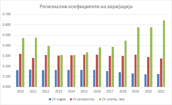 Универзитетскиот професор Димитар Николоски со нашата редакција сподели еден графикон, според кој, како што објаснува, може да се забележи дека регионалните разлики во платите во региони се најниски, потоа следува продуктивноста, а најголеми се разликите во невработеноста.
