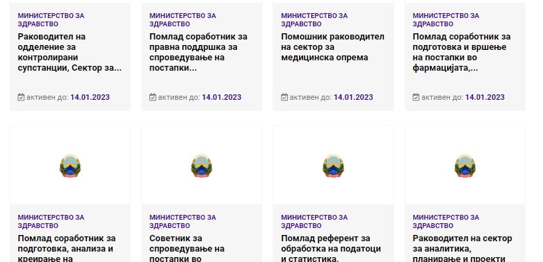 Отворени голем број на работни позиции во Фондот за здравствено осигурување, но и во Министерството за здравство, неколку клиники, во МОН и Фондот за пензинско и инвалидско осигурување.