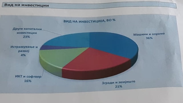 Имено, планираните инвестиции од 161,054,020 евра се распределени на начин што над 58 милиони евра или околу 36,4 % од вкупниот планиран износ ќе биде инвестиран во машини и опрема; над 33 милиони евра или 21 % ќе бидат вложени во згради и земјишта; во ИКТ и софтвер ќе бидат вложени над 24 милиони евра или 15,5 %; над 6 милиони евра или 4,2 % се планирани да се инвестираат во истражувања и развој и над 36 милиони евра или 22,9 % се планирани за други инвестиции.