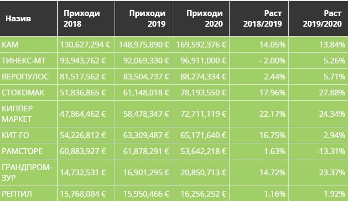 Суверен лидер на пазарот се ланецот на маркети КАМ со вкупно остварени приходи од 169 милиони ЕУР, позиција која КАМ успешно ја одржува во последните 3 години. Покрај тоа, КАМ дополнително ја зајакнува својата позиција со тоа што од година во година се зголемува разликата помеѓу нив и останатите конкуренти. На листата надолу следува една петторка (ТИНЕКС-МТ, ВЕРОПУЛОС, СТОКОМАК,КИППЕР МАРКЕТ И КИТ-ГО) која според износот на приходи е во рамки од 65-88 милиони ЕУР, а последните 3 позиции се резервирани за РАМСТОРЕ,ГРАНДПРОМ-ЗУР и РЕПТИЛ, кои генерирале приходи во износ од 16-53 милиони ЕУР.