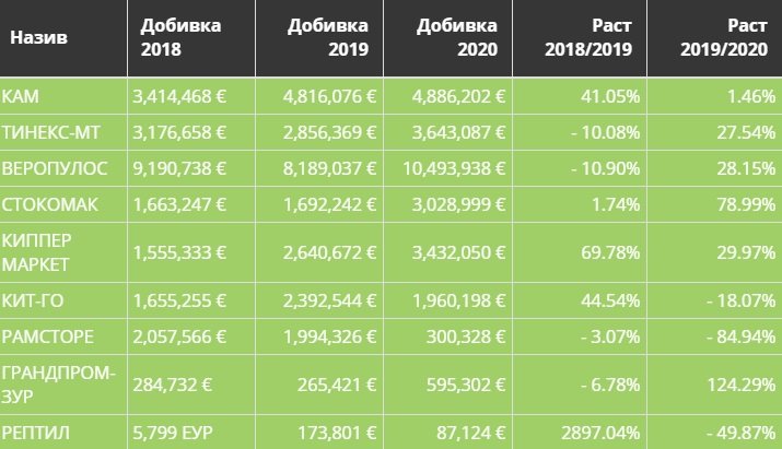 Иако КАМ и ТИНЕКС-МТ имаа највисоки приходи, сепак според остварената добивка неприкосновен лидер е ВЕРОПУЛОС. Оваа компанија ја затворила 2020 година со добивка од над 10 милиони ЕУР, што е повеќе од двојно од најблискиот конкурент КАМ.