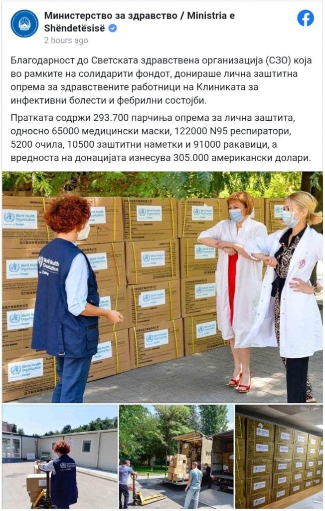 Министерството за здравство упати благодарност до СЗО за донацијата, но и за целокупната поддршка и соработка во справувањето со корона вирусот.