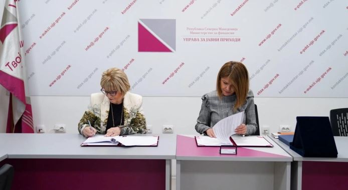 Директорката на Управата за јавни приходи, Сања Лукаревска, и директорката на Државниот инспекторат за труд, Весна Томовска, денеска потпишаа Договор за размена на податоци и соработка. Со овој документ се унапредува меѓуинституционалната соработка и се овозможува поголем увид во тоа кој работодавци, согласно со законски предвидениот рок, задоцнето или воопшто не поднеле МПИН-пресметка за плати, исплатиле плати помали од минималната плата или не исплатиле регрес за годишен одмор.