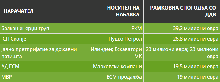 Вкупната вредност на овие 10 најголеми набавки изнесува околу 172 милиони евра, при што првите 5 вредат речиси 128 милиони евра.