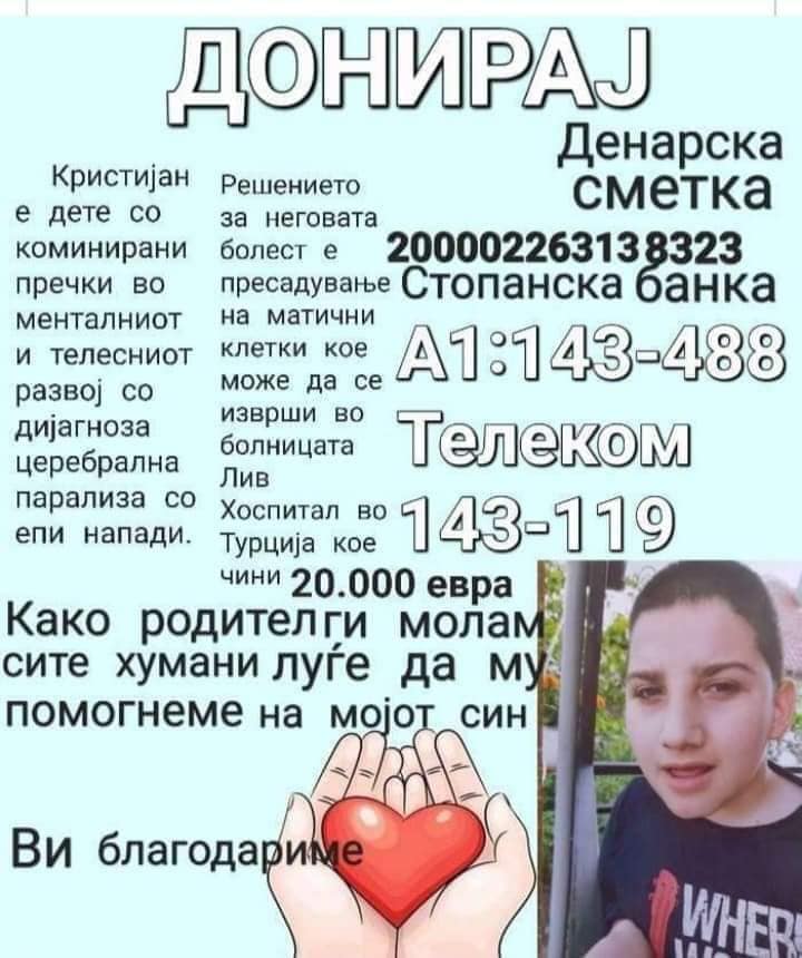 Кристијан е дете со комбинирани пречки во менталниот и телесниот развој со дијагноза церебрална парализа и епи напади. Решението за неговата болест е пресадување на матични клетки кое може да се изврши во Турција. Сепак, за да може да се оперира, потребни му се финансиски средства.