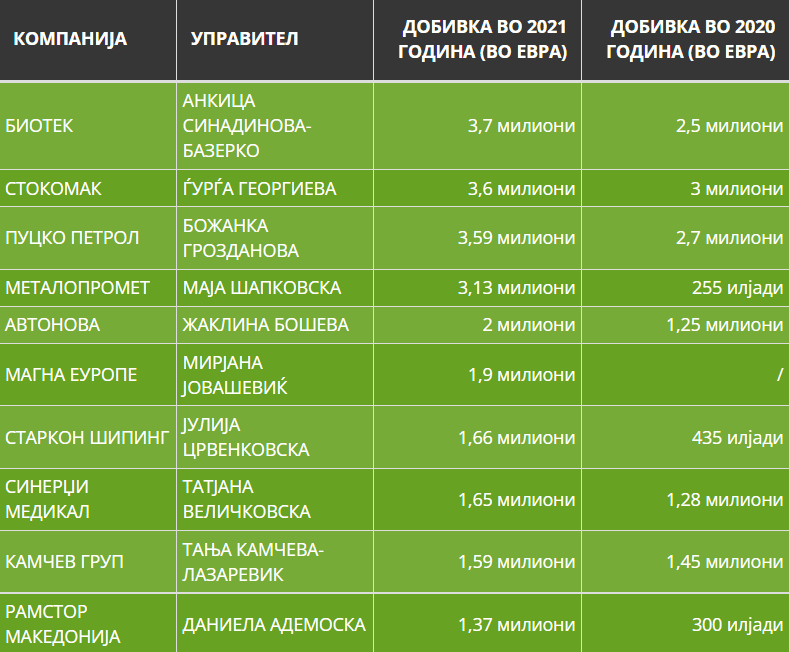 Во светот, за жал, женскиот труд сѐ уште се цени помалку од машкиот, а и на менаџерските позиции жени има помалку отколку мажи. Порталот Пари, со цел да го мотивира женското претприемништво, ги открива имињата на 10 дами кои се стопроцентни управителки на компании. Податоците покажуваат дека тие лани успеале да изменаџираат компании кои направиле вкупна добивка од над 24 милиони евра, при што сите компании работеле подобро отколку во претходната година. Во 2020 година, истите компании реализирале над 13 милиони евра добивка. Работењето на компаниите во 2022 година, очекувано, е подобро од работењето во 2020 година. И податоците од националната статистика покажуваат раст на БДП од 4 проценти во 2021 во однос на 2020 година. Сепак, овие компании покажале исклучително висок годишен раст на добивката. Вкупниот раст на сите 10 компании е дури 84,6 проценти.