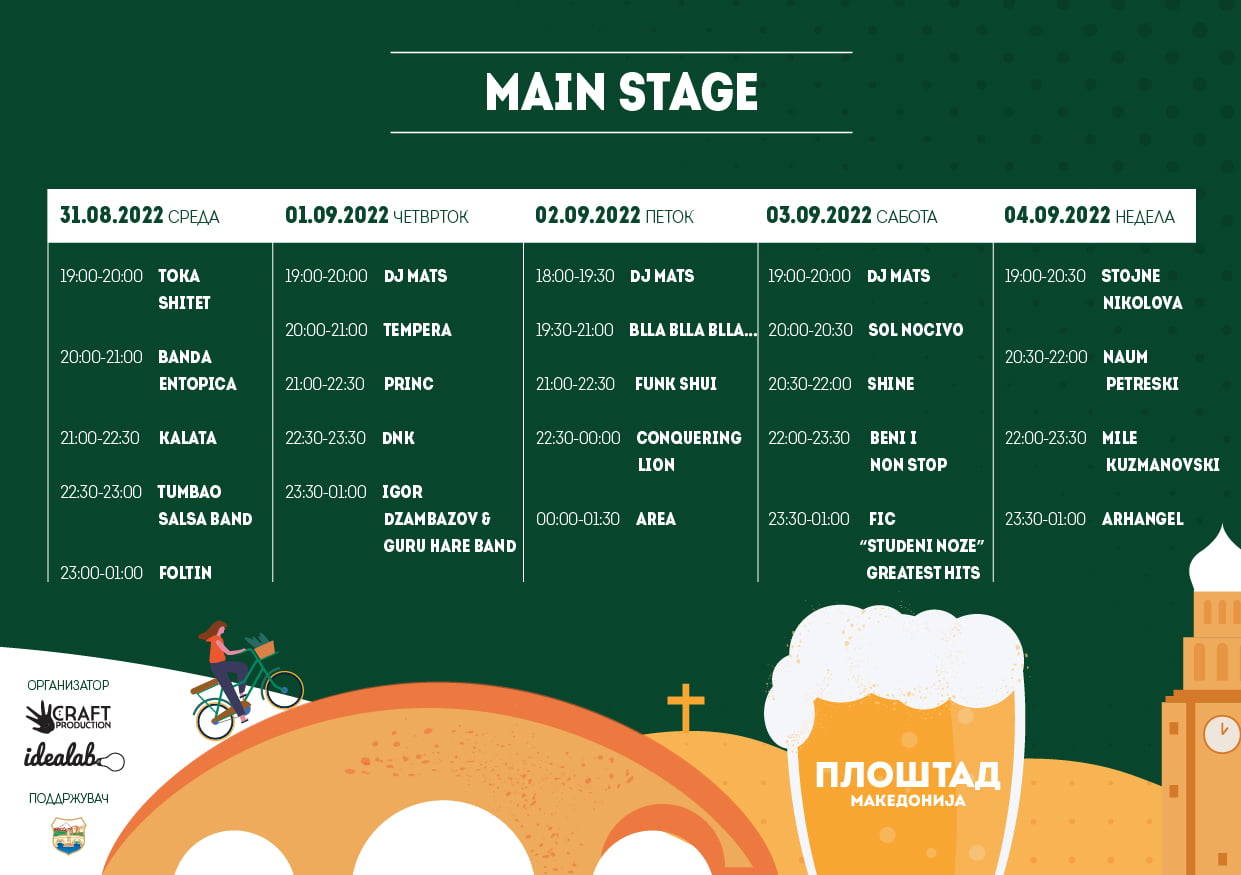 Пиволенд 2022 ќе трае 5 дена. Програмата започнува на 31.08.2022 (среда) и ќе трае до 04.09.2022 (недела), а влезот за посетителите ќе биде бесплатен.