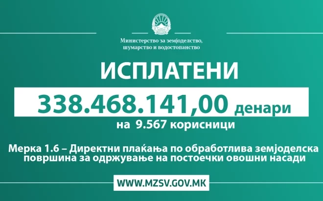 Прочитајте повеќеМинистерството за земјоделство, шумарство и водостопанство (МЗШВ) соопшти дека се исплатени 338.468.141 денар на 9.567 овоштари. Како што информира МЗШВ,