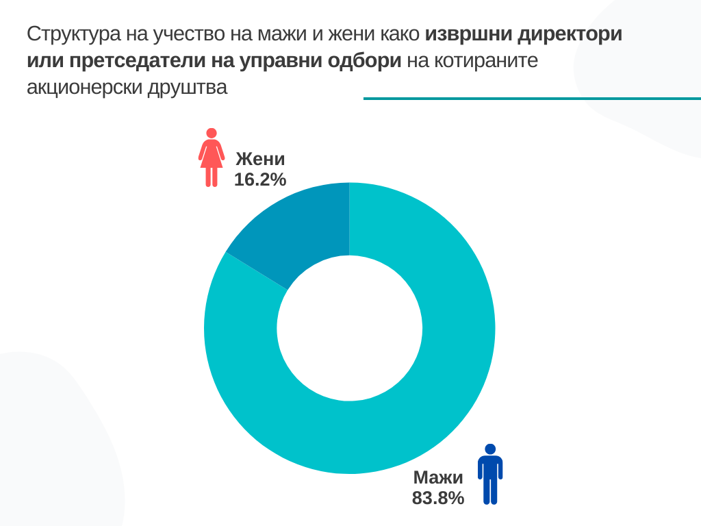 Од сите извршни директори или претседатели на управни одбори на котираните компании, само 16,2% се жени.