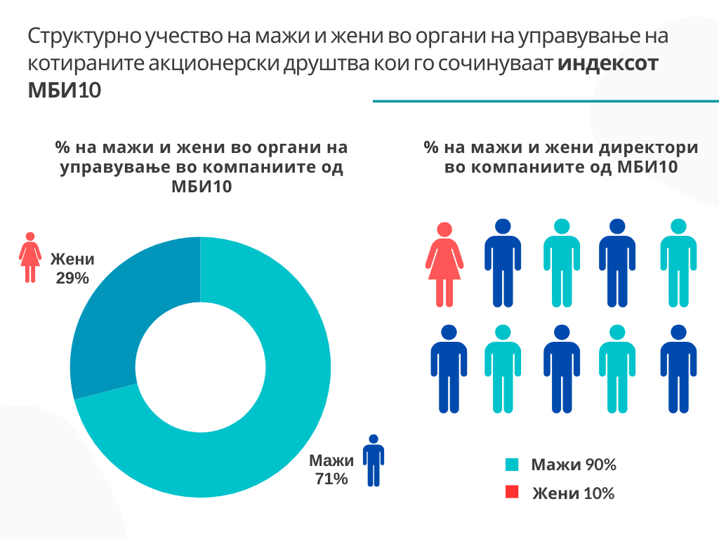 Во МБИ10 компаниите, 29,0% од членовите на органите на управување се жени, а само една компанија е управувана од жена извршен директор или претседател на управен одбор.