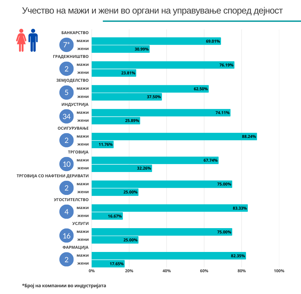 Следниот графикон го покажува соодносот на мажи и жени во органите на управување на котираните компании, поделени по дејност. Разликата е најизразена во дејностите осигурување, угостителство и фармација.
