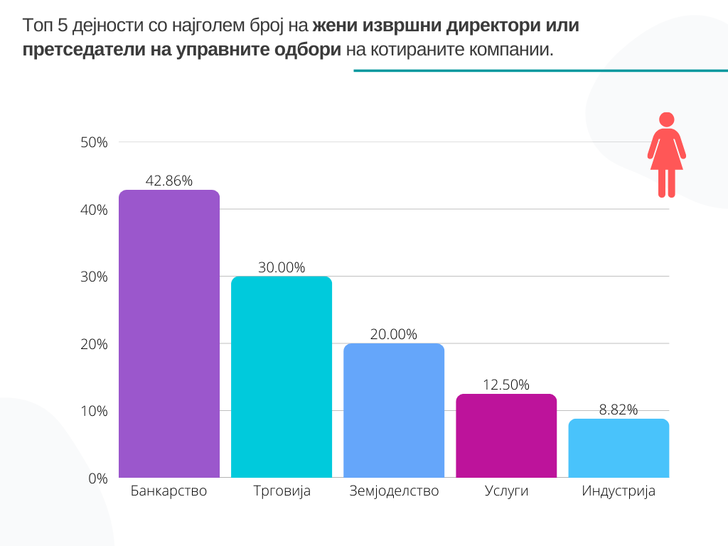 Најголем број на жени извршни директори или претседатели на управните одбори кај котираните компании има во дејностите банкарство, трговија, земјоделство, услуги и индустрија.