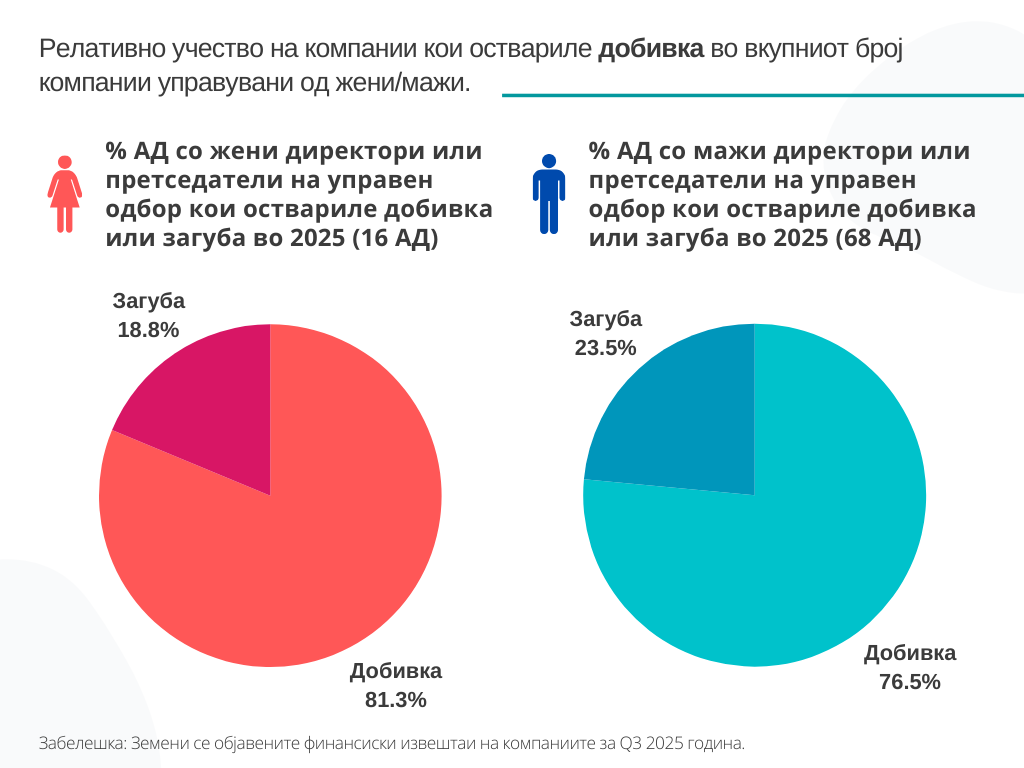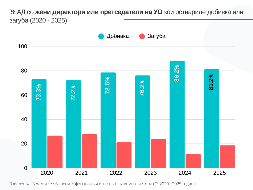 Котираните компании управувани од жени директори или претседатели на управен одбор, во 2025 година, почесто оствариле добивка, во споредба со котираните компании управувани од мажи.