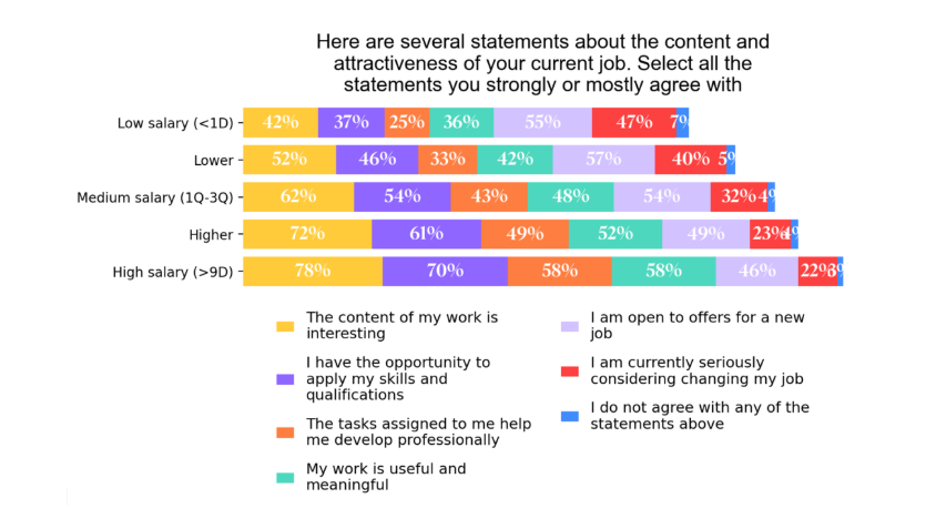 Истражувањето покажува дека повисоко платените вработени се почувствуваат поангажирани, подобро ги користат своите вештини и остануваат стабилни на своите позиции. Сепак, речиси половина од нив би размислиле за заминување доколку им се понуди нова работа. Меѓу вработените со пониски примања, 40–47% активно бараат промена – јасен сигнал дека конкурентната плата и видливите можности за раст се критични за задржување на кадарот.