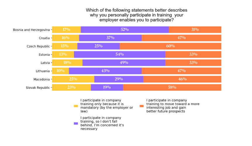 Речиси половина од вработените ја гледаат обуката како лична инвестиција во своите вештини и идни кариерни патеки, а не само како обврска. Овој пристап е особено силен во Чешка и Словачка, каде околу 60% ја следат обуката за подобрување на своите кариерни перспективи. За работодавачите, ова е можност да ја користат обуката не само како основа за ангажираност и лојалност, туку и како поттик за раст на бизнисот преку развој на поскоскувски и вешт кадар.