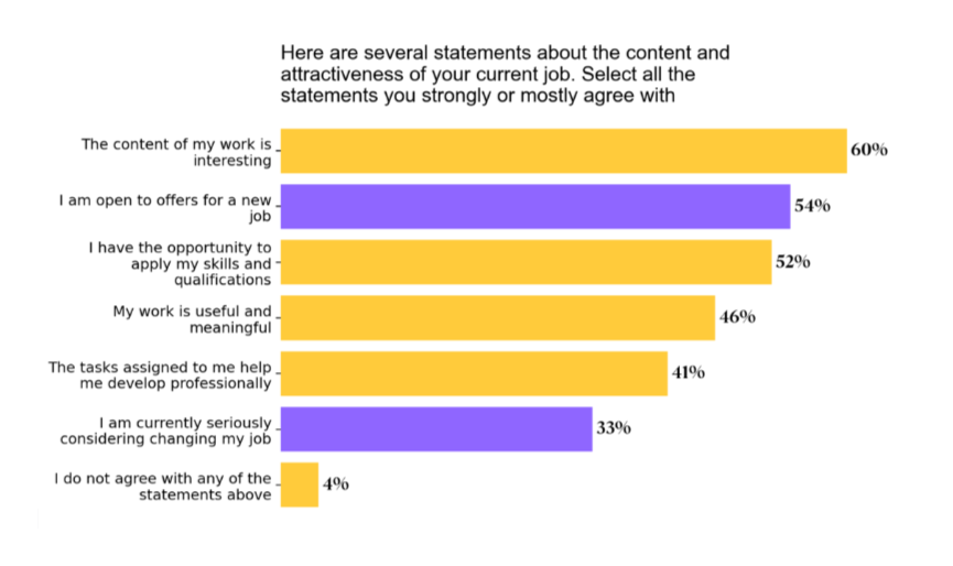 Истражувањето ја истакнува парадоксалната состојба на денешното работно место. Повеќе од половина од вработените наведуваат дека нивната работа е интересна и усогласена со нивните вештини, што покажува дека многу организации успешно го усогласуваат талентот со значајни задачи. Сепак, под оваа позитивна површина, една третина од сите вработени активно размислува за промена на работното место. Ова укажува дека, иако значајната работа ја зголемува ангажираноста, таа не гарантира долгорочна лојалност.